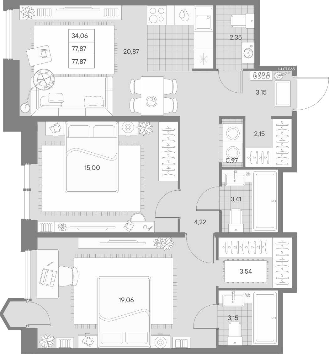 - S общая: 77.87 м2