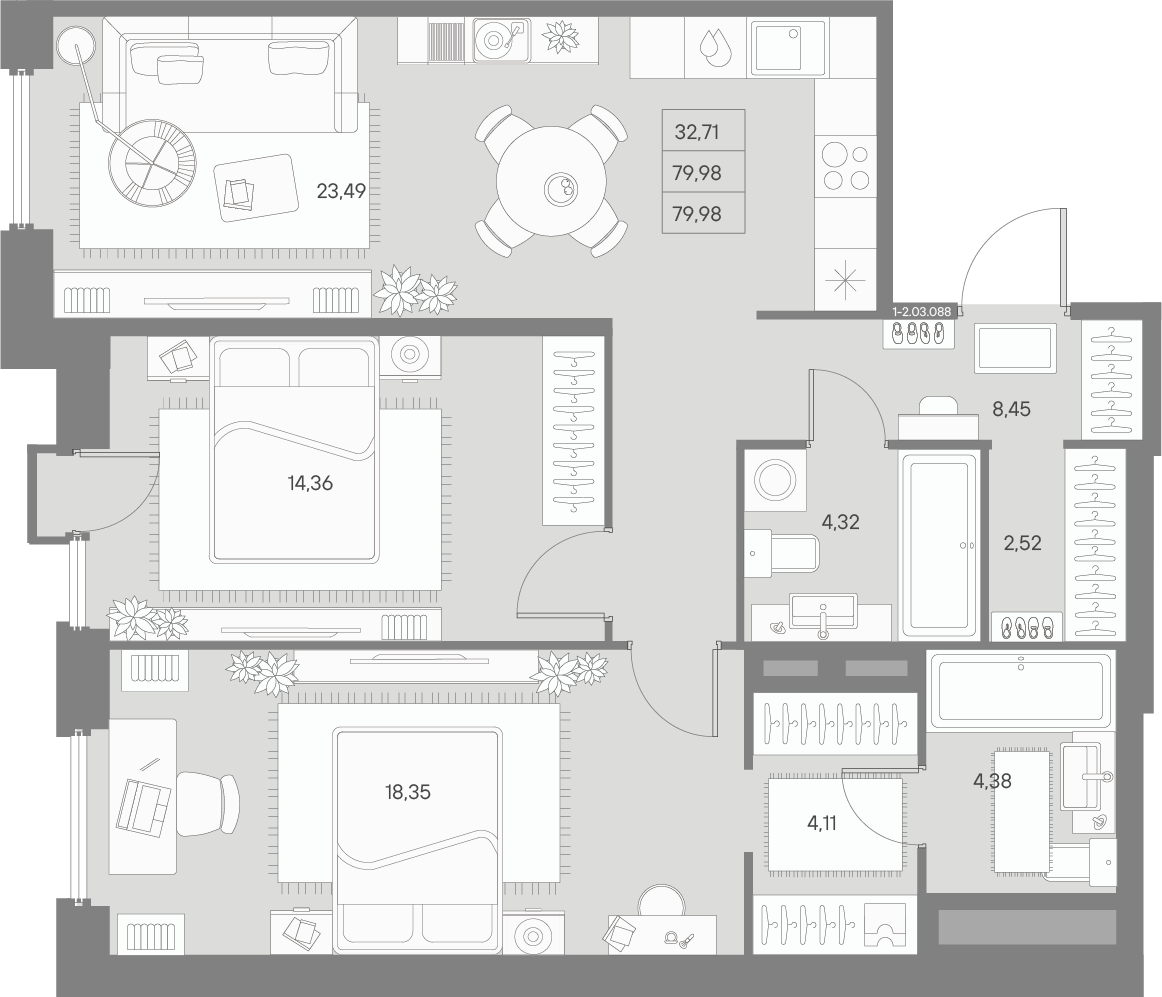 - S общая: 79.98 м2