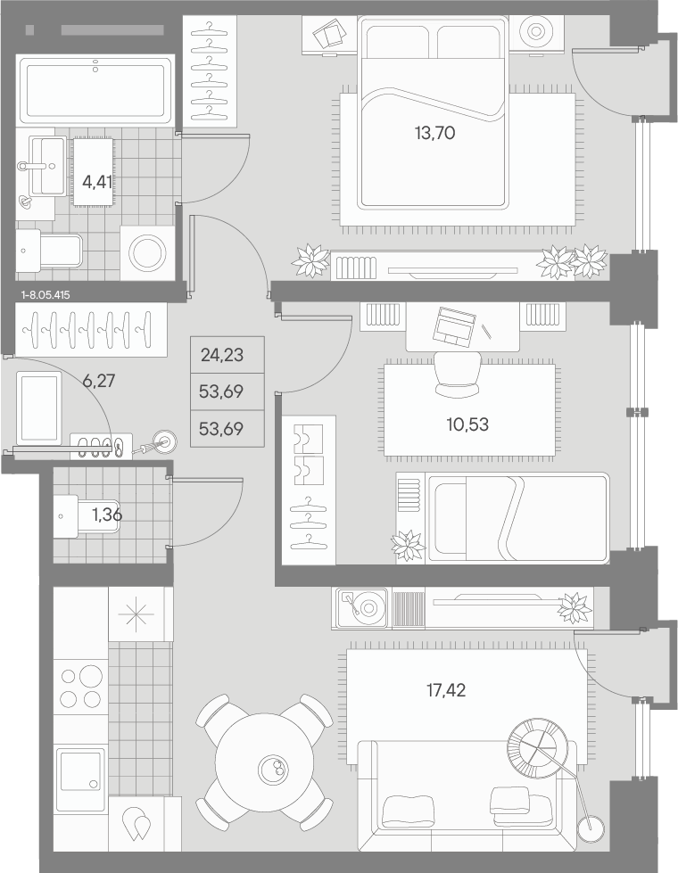 - S общая: 53.69 м2