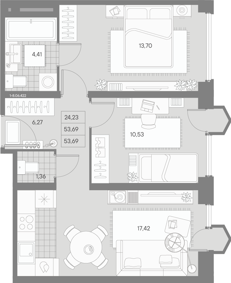 - S общая: 53.69 м2