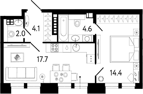 - S общая: 42.8 м2