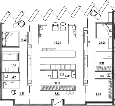 В проекте представлены апартаменты с европланировками на 2–4 комнаты. Высота потолков варьируется от 2,65 до 3,5 метров в зависимости от этажа, в помещениях установлены панорамные окна. Квартиры идут с подчистовой отделкой формата WhiteBox: выполнена подготовка стен под покраску, установлены сантехника и электрика, уложены полы, смонтировано освещение. Квартиры оснащены системой умного дома.