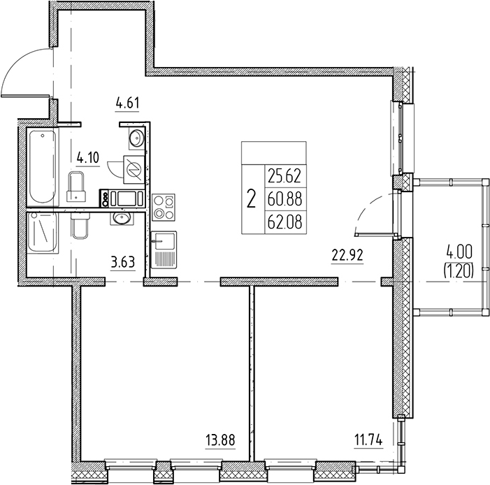 - S общая: 60.88 м2