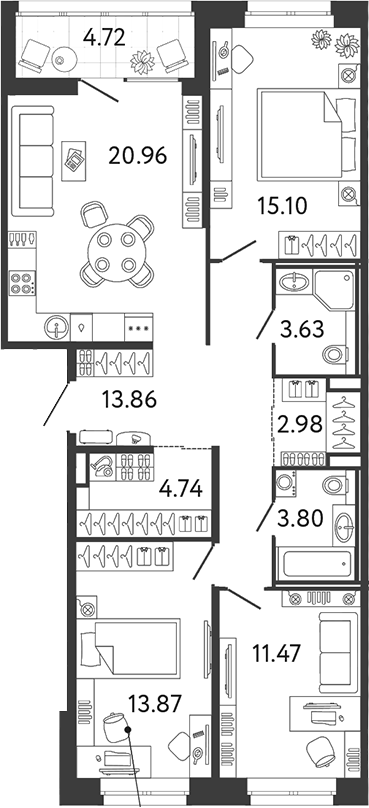 В комплексе представлен обширный выбор планировок: от студий до квартир с 4 комнатами. Площадь квартир – от 24 до 90 кв. метров. Квартиры сдаются с подчистовой отделкой и потолками высотой 2,7 метров.