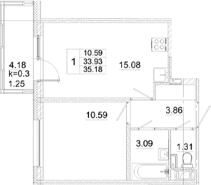 - S общая: 33.93 м2