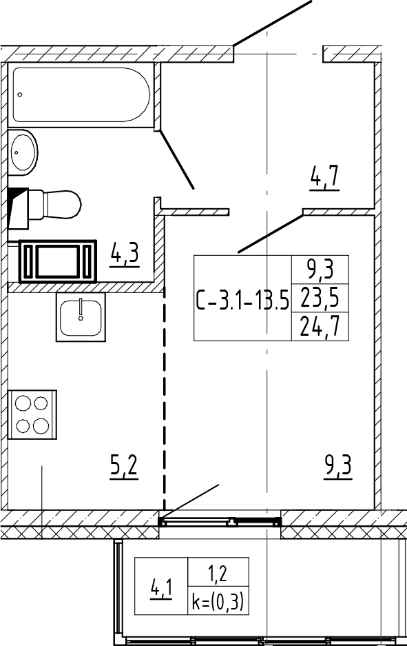 - S общая: 23.5 м2