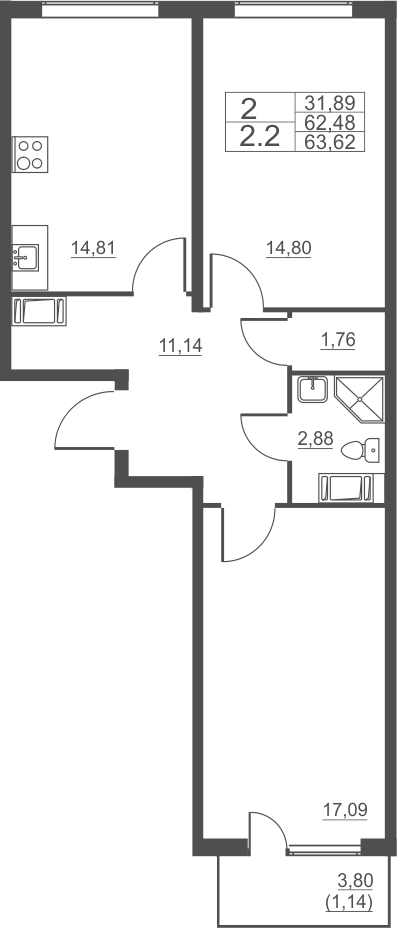 - S общая: 62.48 м2