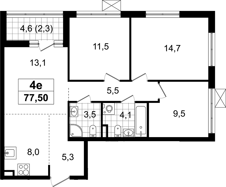 - Комнат: 4Е-к.кв