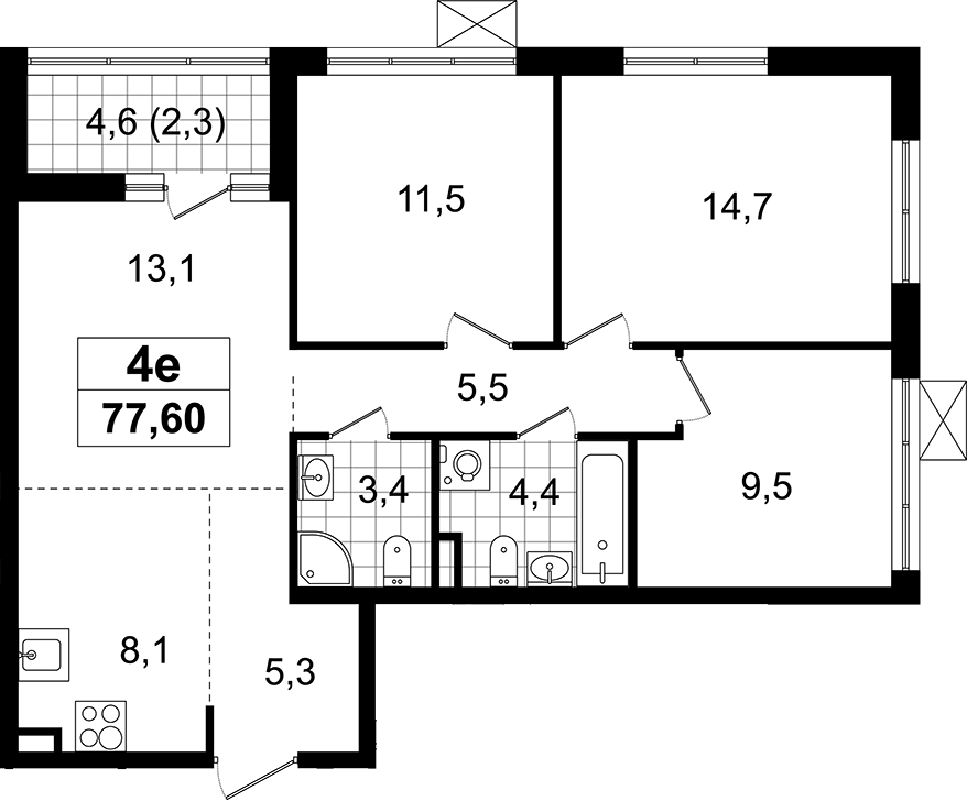 - Комнат: 4Е-к.кв
