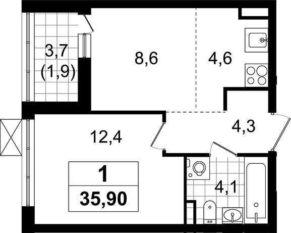 - Комнат: 1-к.кв