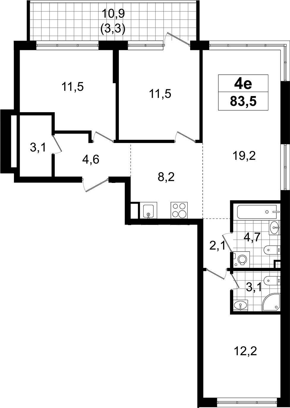 - Комнат: 4Е-к.кв
