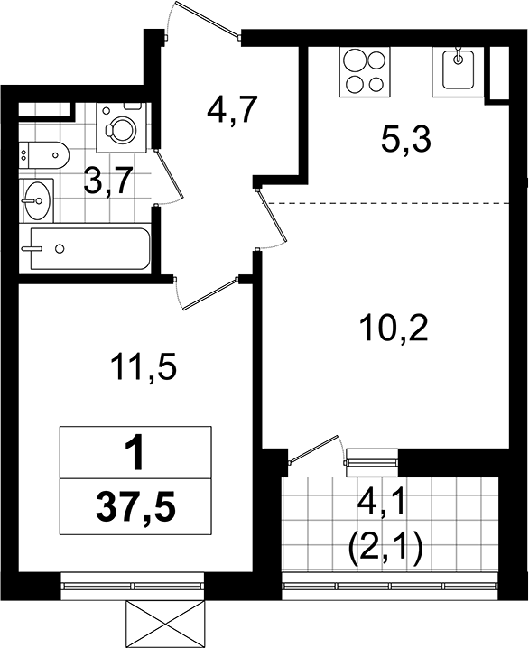 - Комнат: 1-к.кв