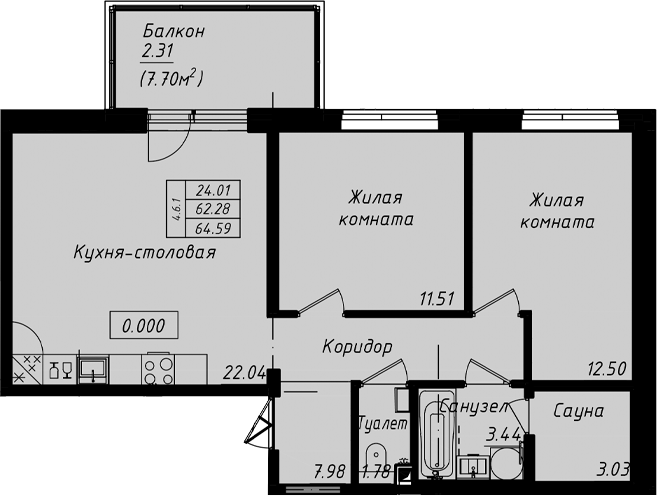 - S общая: 62.28 м2