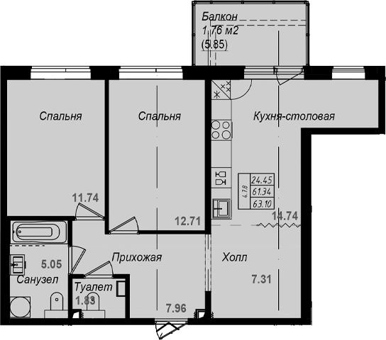 - S общая: 61.34 м2