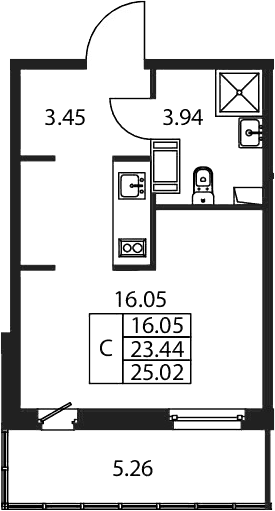 - S общая: 23.44 м2
