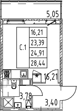 - S общая: 23.39 м2