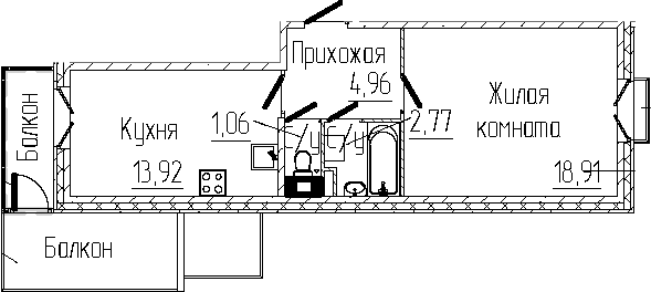 - Комнат: 1-к.кв