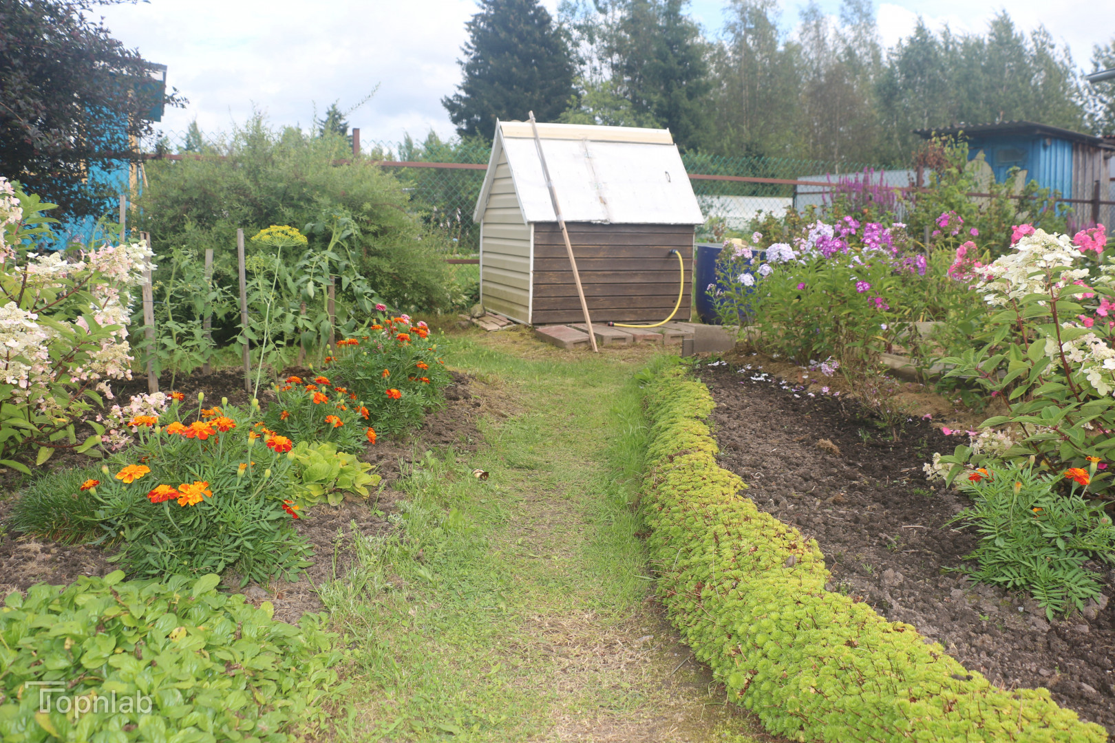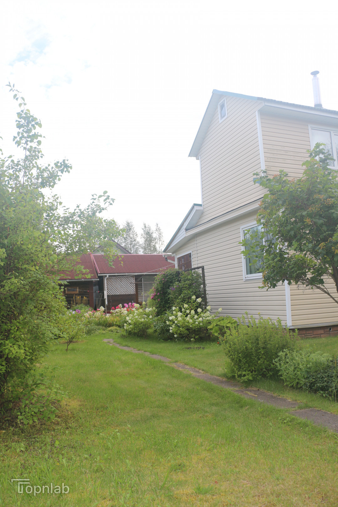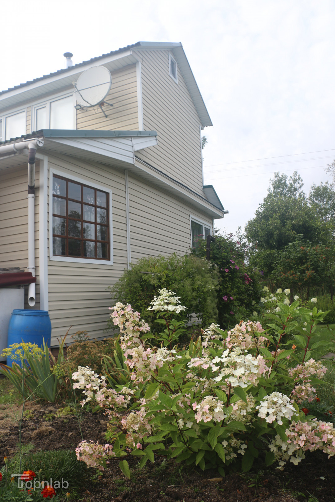 На участке есть плодоносящие яблони, смородина, ежевика, земляника, Сделан въезд на участок для парковки автомобиля. Очень много сортовых цветов и кустарников: пионы, гортензии, клематисы.