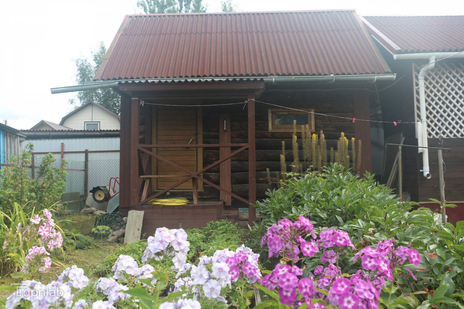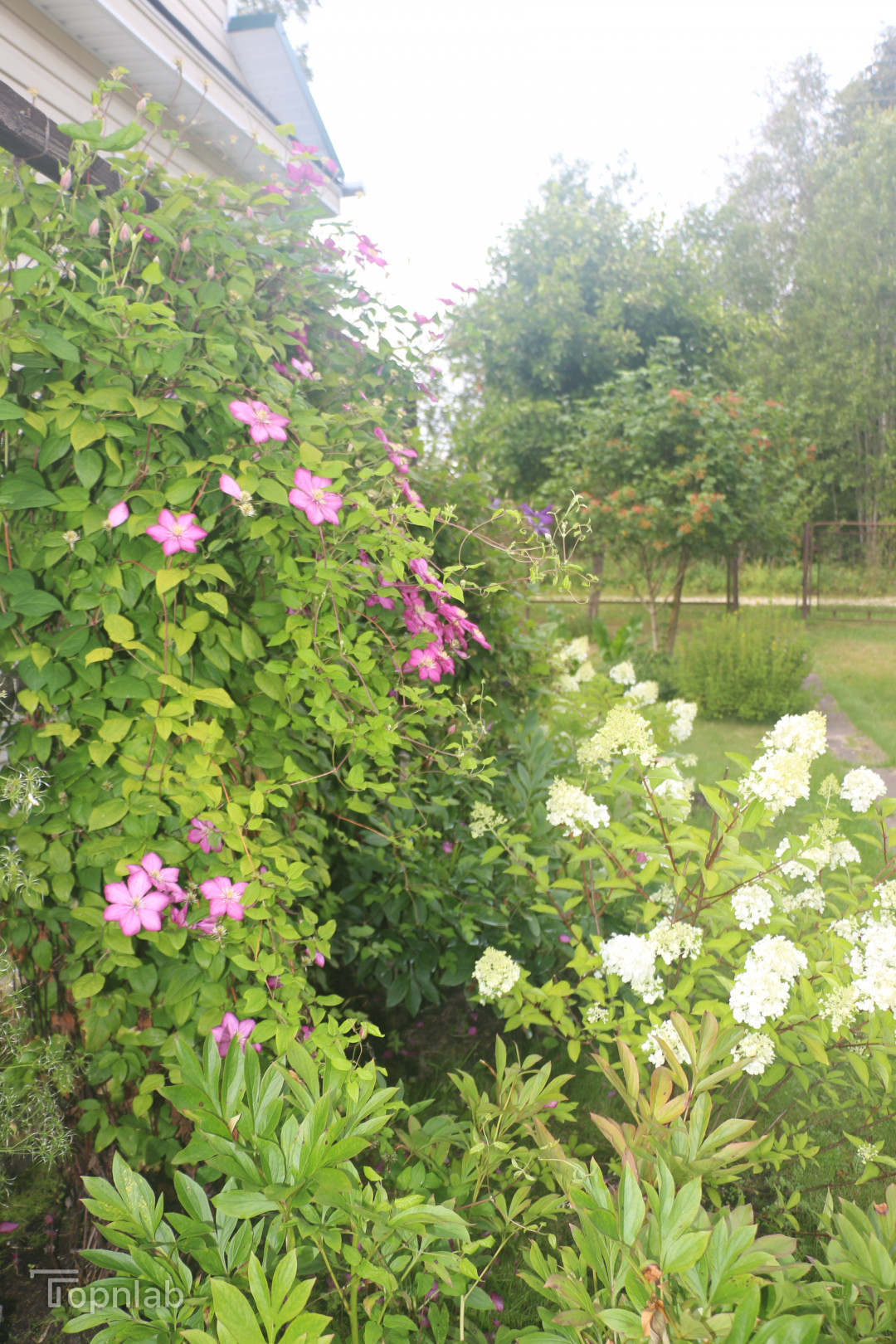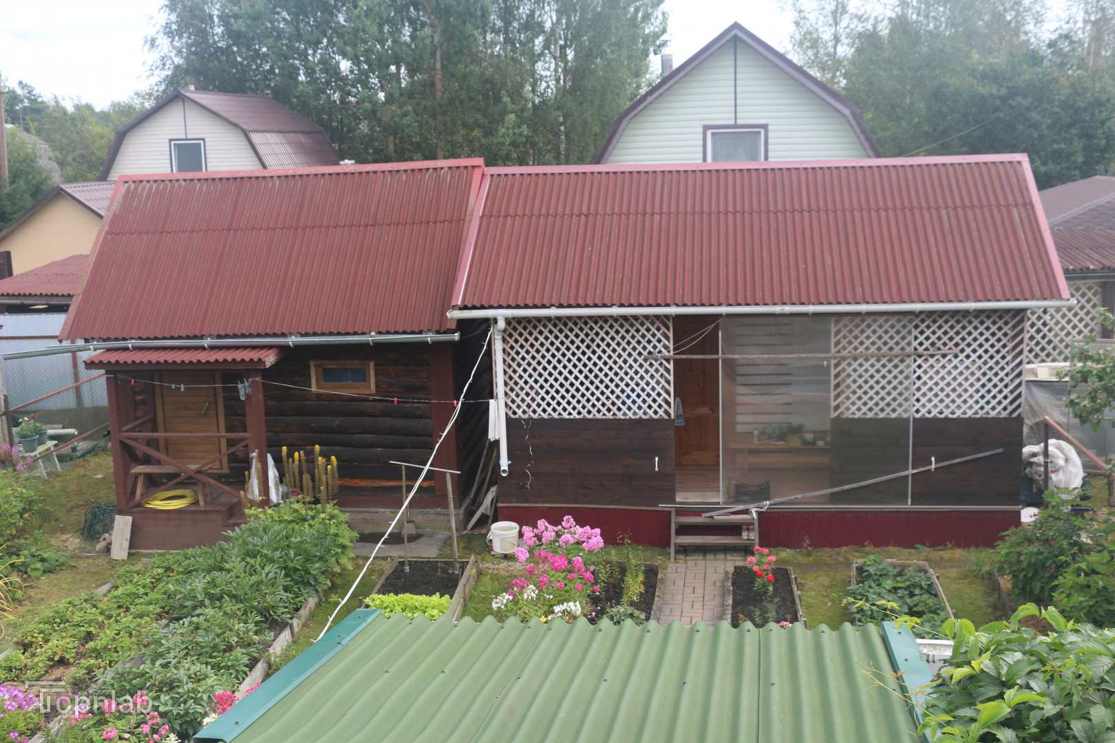 На участке есть плодоносящие яблони, смородина, ежевика, земляника, Сделан въезд на участок для парковки автомобиля. Очень много сортовых цветов и кустарников: пионы, гортензии, клематисы.