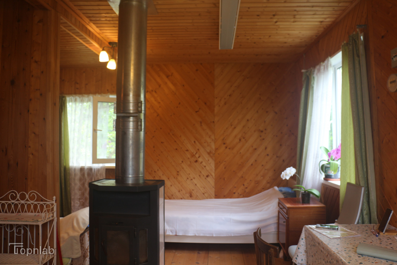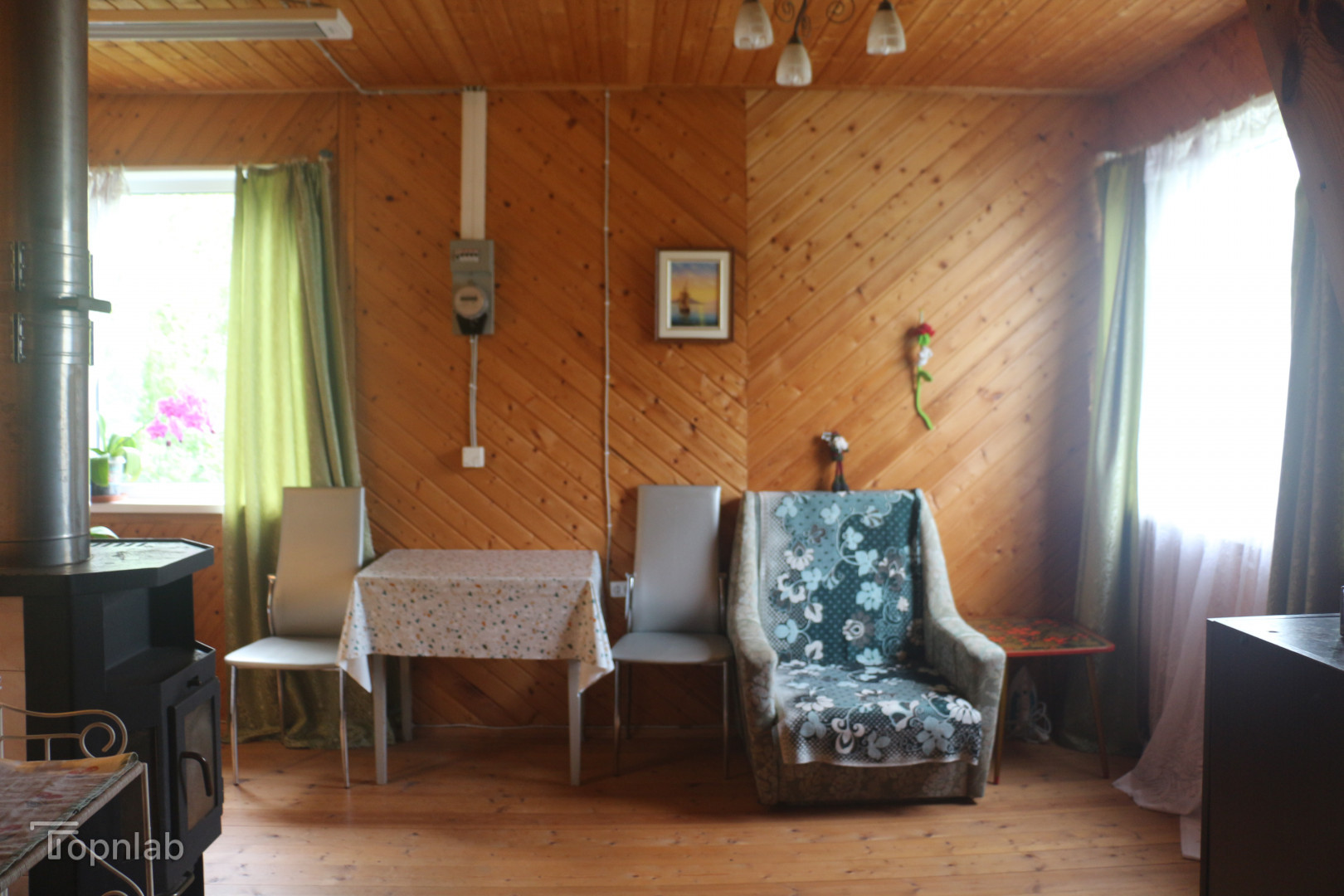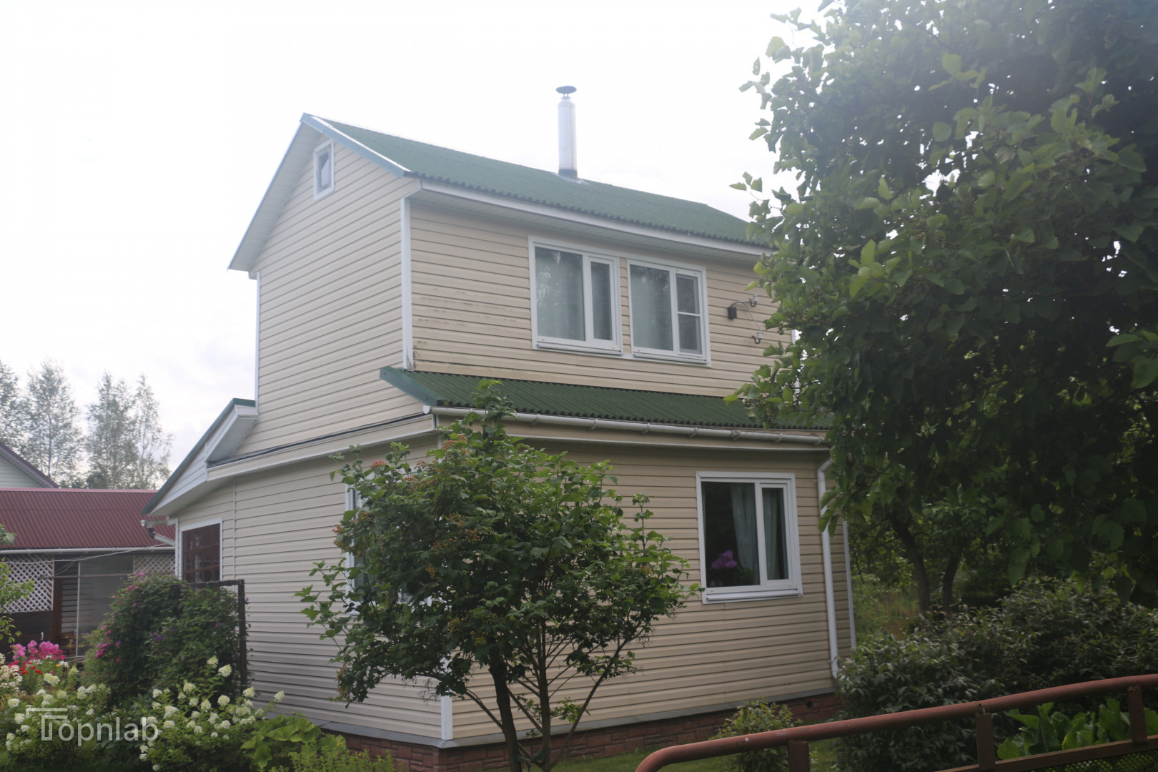 Дом построен на крепком ленточном фундаменте и утеплён. Первый этаж состоит из летней кухни-веранды, гостиной с современным чугунным камином-печью, есть альтернативное отопление - инфракрасный обогреватель.
